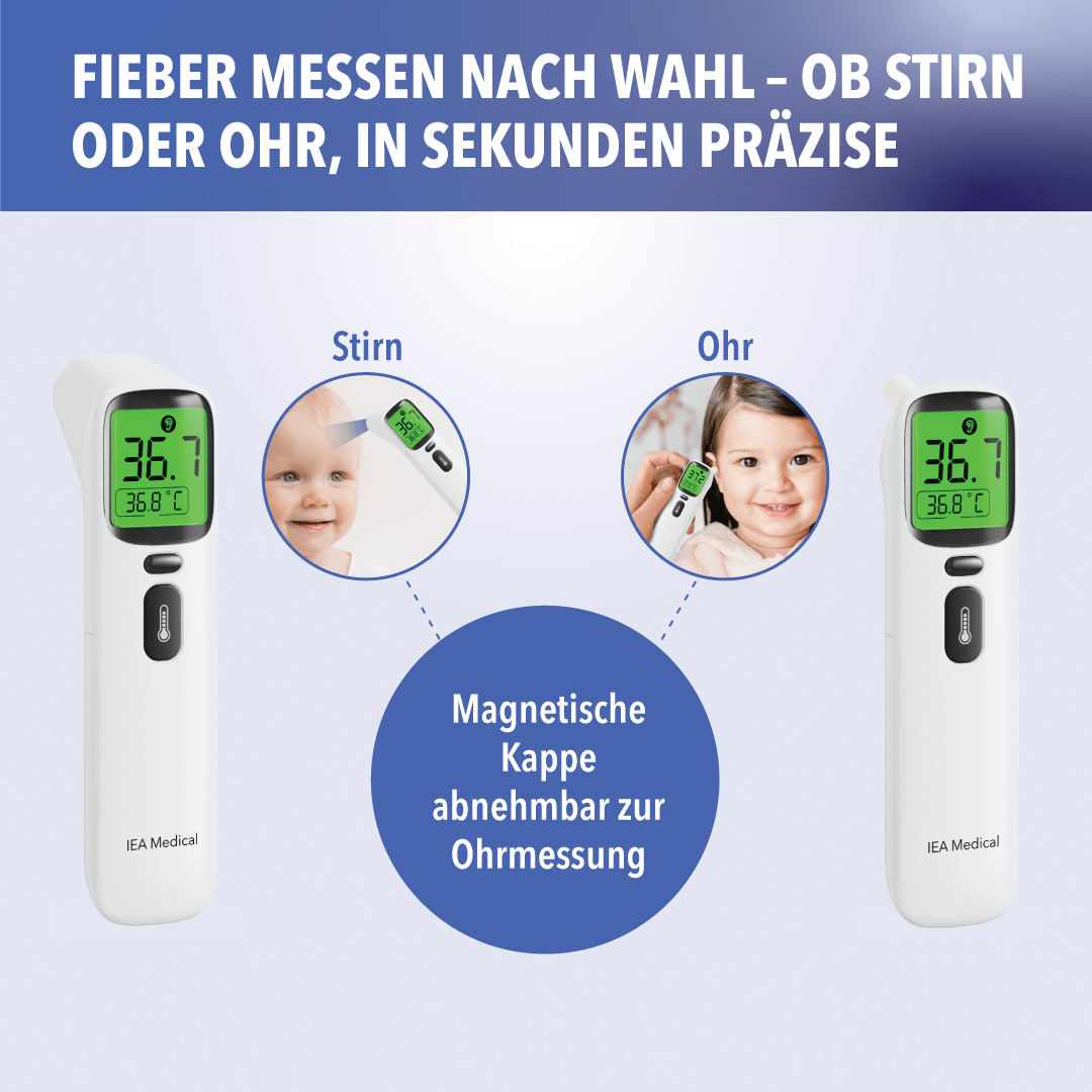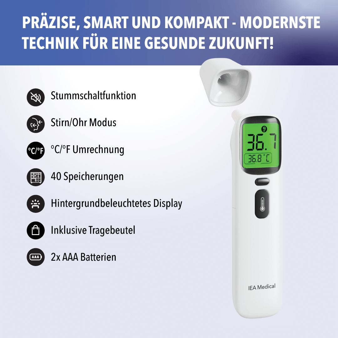 - Digitales Fieberthermometer: Stirn/Ohr, 0–3 cm kontaktlos, beleuchtetes Display.