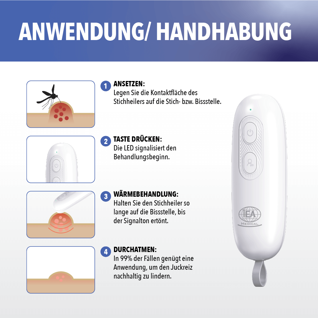 Die Anwendung ist denkbar einfach: Ein Knopfdruck genügt, und schon kannst du die Spitze direkt auf den Stich auflegen. Innerhalb weniger Sekunden beruhigt die Wärme den Juckreiz und reduziert die Schwellung, damit du dich schnell wieder wohlfühlst.